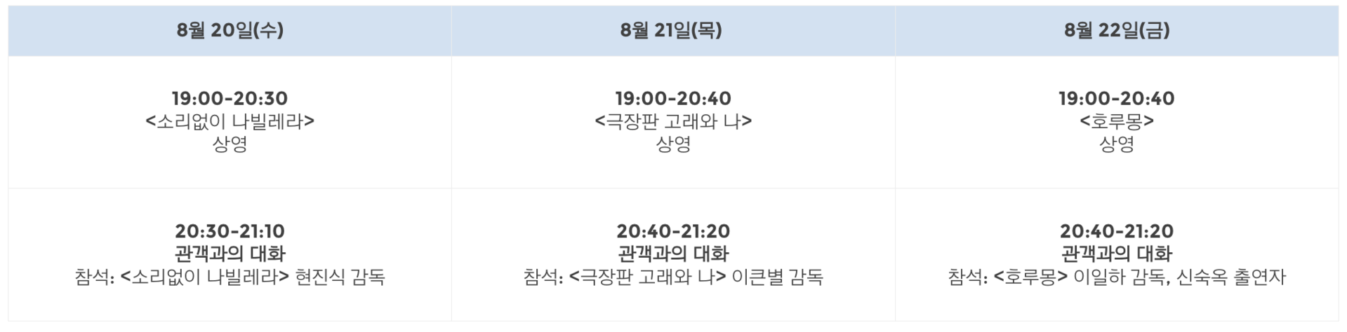 8월 20일(수) | 8월 21일(목) | 8월 22일(금) |